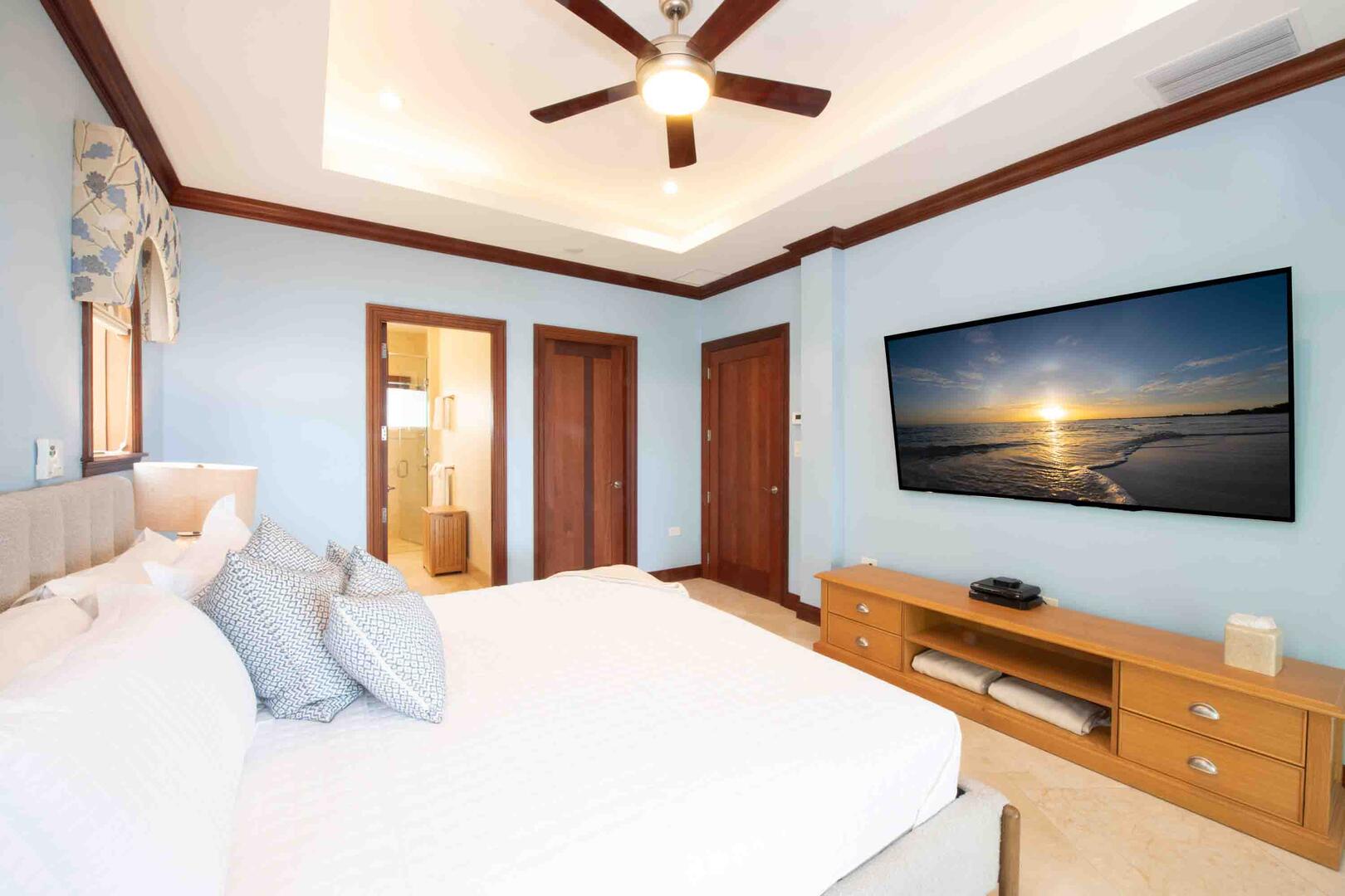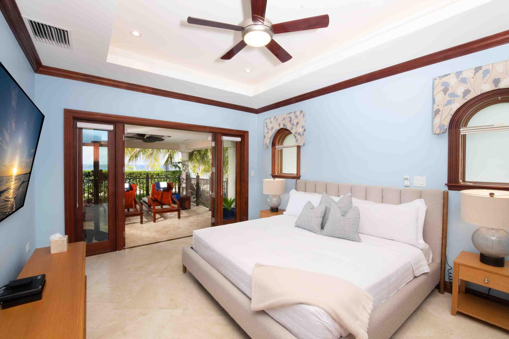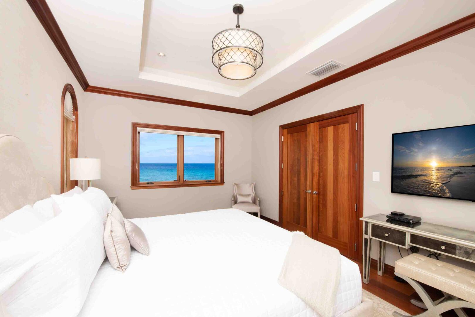 Bedroom 1 on the lower level furnished with a king bed, HD television, and walkout access to the ocean veranda.