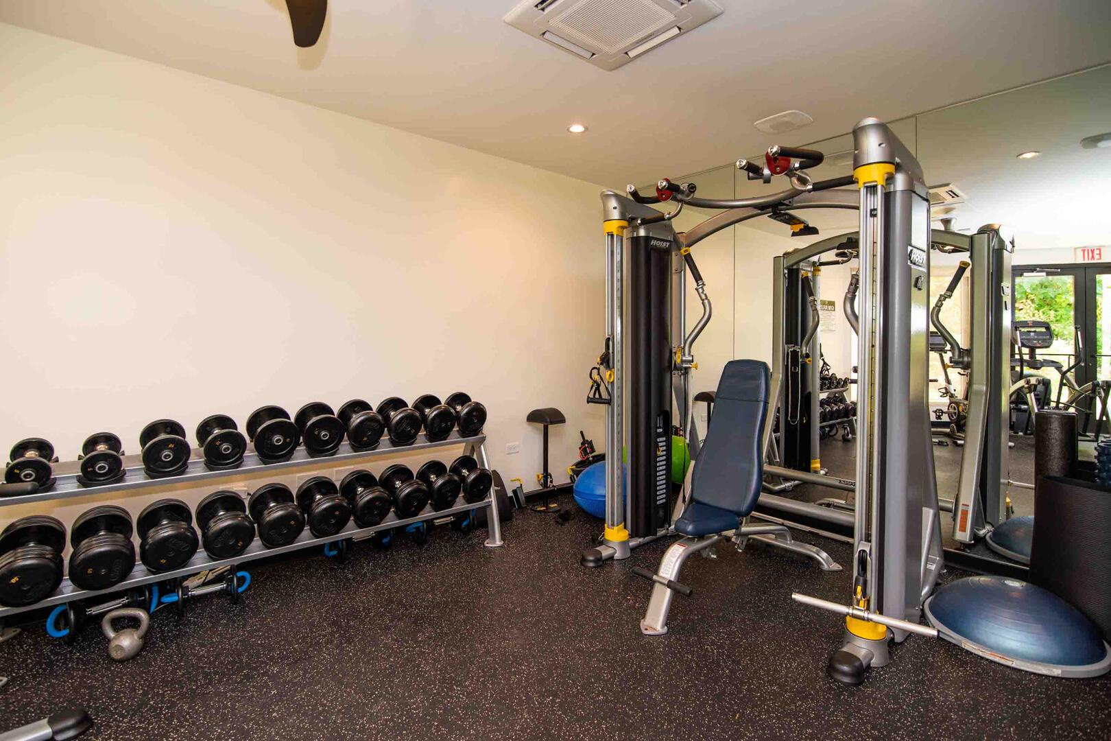 The gym is equipped with cardio machines, free weights, and cable machines.