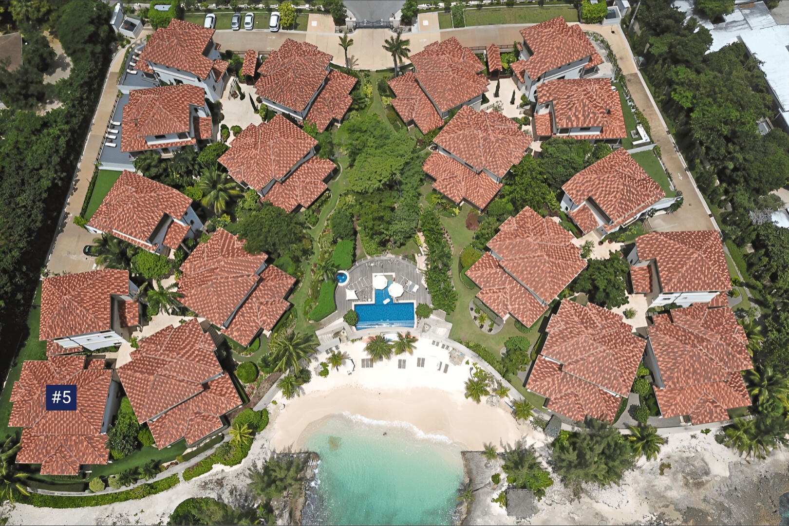 Aerial view of the Casa Luna grounds. #5 is closest to the ocean and steps from the beach cove.
